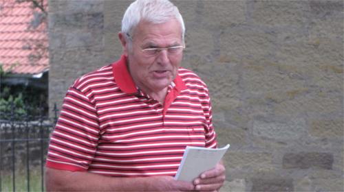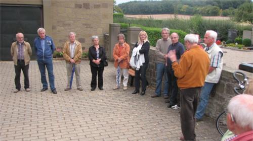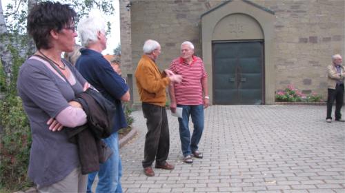 Unsere Bilder zeigen die Begrüßung durch Vorsitzenden Heinz Kruppa (obere Reihe), darunter aufmerksam lauschende Zuhörer bei den Ausführungen von Valentin Pfister, der von Julius Katzenberger, der alte Bilder herumreichte, unterstützt wurde. Zunächst wurde die schlichte, sehr geschmackvoll eingerichtete Kirche - erbaut aus heimischem Sandstein - besichtigt. Beim Rundgang durch den Ort, vorbei an alten Felsenkellern, ehemaligen Handwerksbetrieben, früheren Gastwirtschaften, mächtigen, teilweise neu aufgestockten Häusern, Brunnen, der Dorflinde, ging es ins alte Schulhaus zum eigentlichen Stammtisch-Plausch.
