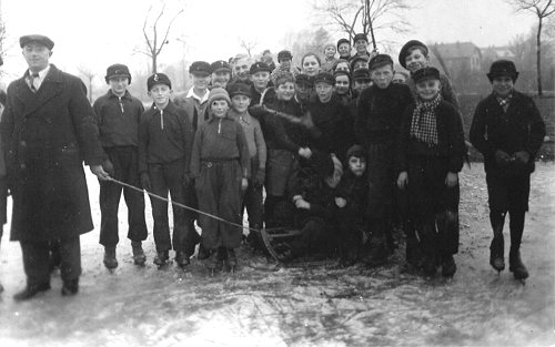 dahinter von links: Georg Comes, Siegried Hesselbach, Alois Hofmann, Heinrich Seuffert, ..., Emilie Schleyer, Karl Biller, Rudi Wagenbrenner, Karl Weigand, auf Schlitten: ..., Erich Reith