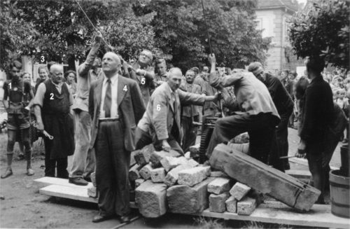 Juni 2005 Glockenweihe vor 55 Jahren am 25. Juni 1950; Aufzug der Glocken: 1 Wahl Franz; 2 Strasser 3 Geis Ida; 4 Bgm. Gräb; 5 Röckelein Ludwig; 6 Emmerling Alfons; 7 Freibert Robert; 8 Kruppa Klaus;